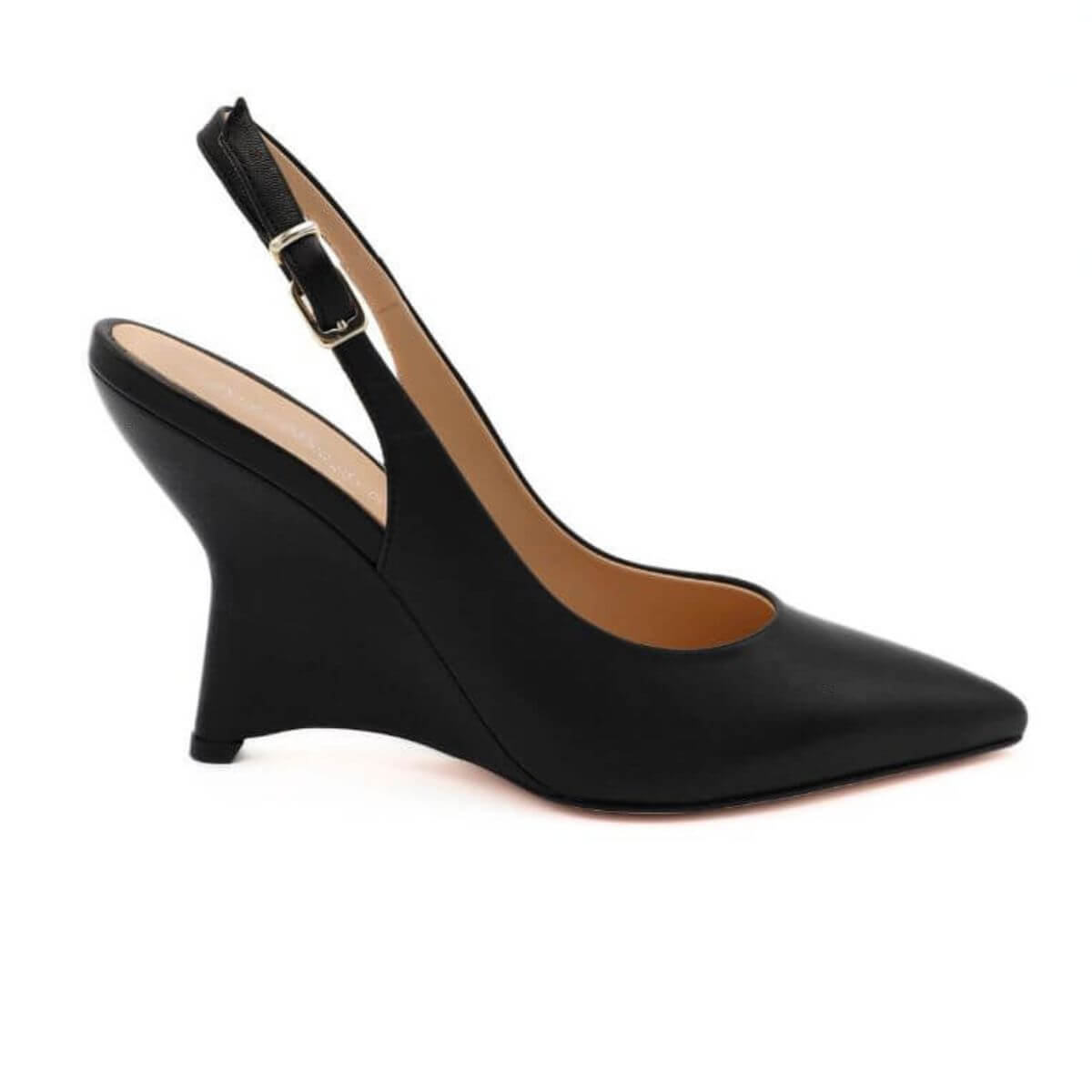 Slingback da donna di ALESSANDRA PELUSO. Realizzato in pelle nappa nero, rivestito anche nella zeppa; chiusura con cinturino regolabile. Interno e sottopiede, foderato in pelle. Suola in cuoio, con tacco-zeppa dalla forma particolare ma sofisticata (altezza: 10cm)