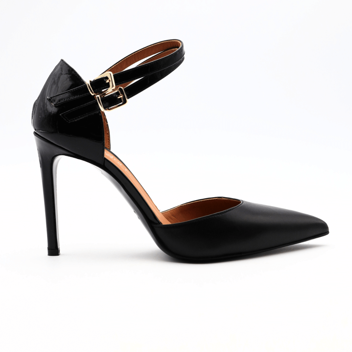 Décolleté di ALESSANDRA PELUSO realizzata in pelle nera: punta in morbida nappa e retro in pelle verniciata. Interno e sottopiede completamente rivestiti in pelle e suola in cuoio. Chiusura con cinturini regolabili. Realizzata a mano.