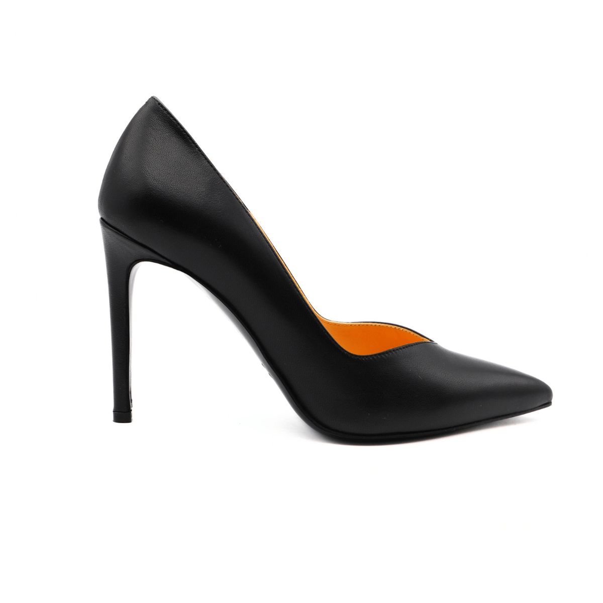 Décolleté di ALESSANDRA PELUSO realizzata in morbida pelle nera. La tomaia presenta uno scollo a V, interno e sottopiede completamente rivestiti in pelle e suola in cuoio. Realizzata a mano.