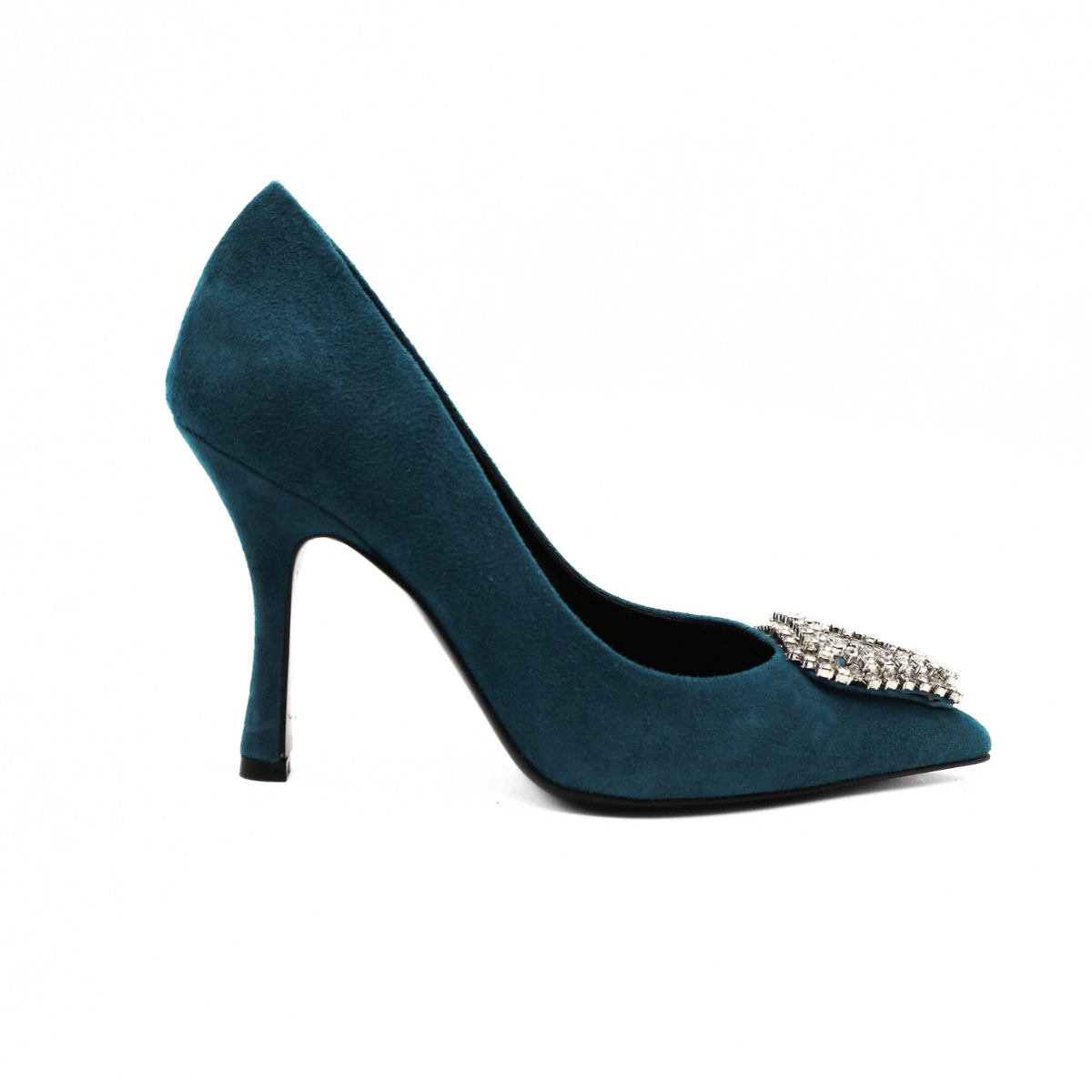 Décolleté di ALESSANDRA PELUSO realizzata in camoscio color petrolio, con accessorio brillantinato frontale. Interno e sottopiede completamente rivestiti in pelle e suola in cuoio. Realizzata a mano.