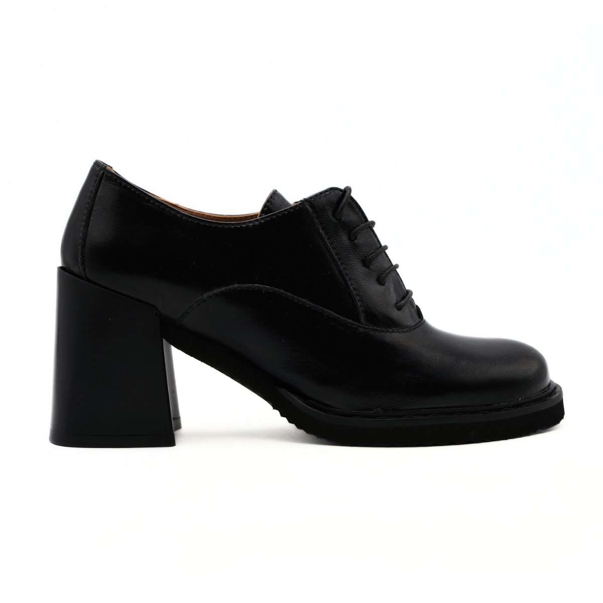Francesina con tacco di ALESSANDRA PELUSO realizzata in morbida pelle naplak. La tomaia presenta le cuciture tipiche del modello francesina e l'allacciatura elegante è in tono. Interno e sottopiede completamente rivestiti in pelle e suola antiscivolo in gomma. Realizzata a mano.