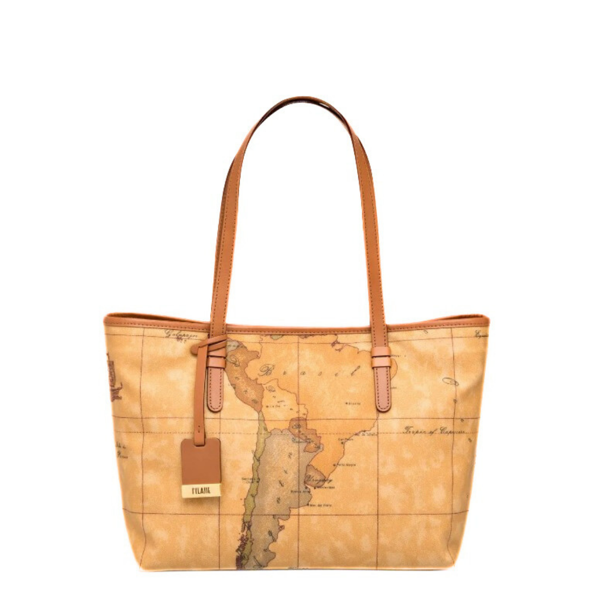 Borsa shopping in tessuto stampato con cartina geografica Geo Classic, con manici, chiusura con bottone a calamita, fondo in pelle di vacchetta, targhetta con logo. Pratica e funzionale, ti accompagnerà al lavoro e nel tempo libero.