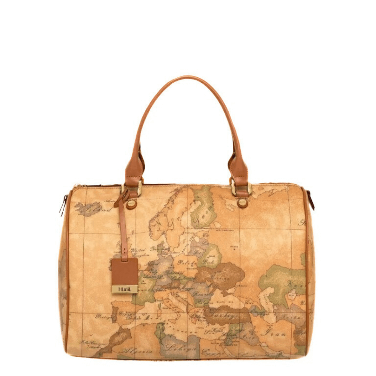 Borsa a bauletto di ALVIERO MARTINI 1^ CLASSE in tessuto stampato con cartina geografica Geo Classic con manici tubolari in pelle color cuoio, metalleria con logo 1AClasse e finiture in oro, chiusura con zip. Presenta i dettagli accurati e le rifiniture preziose tipiche del Made in Italy. Capiente e versatile, saprà adattarsi con stile a tutti i tuoi look.