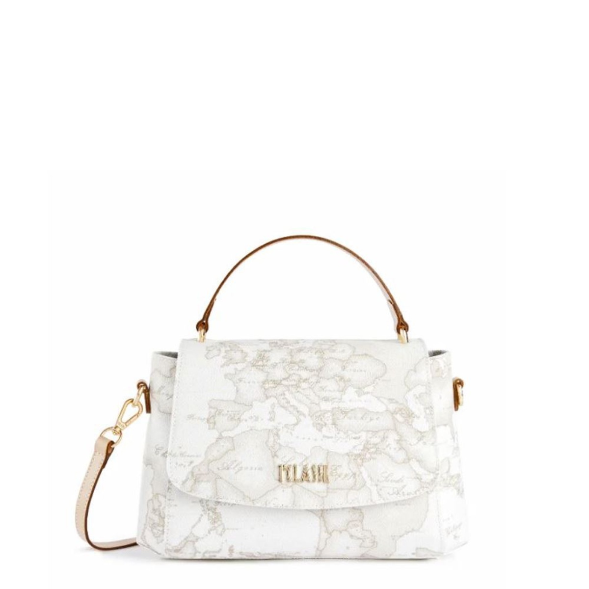Borsa a mano di ALVIERO MARTINI 1^CLASSE. Realizzata esternamente da tessuto saffiano stampa Geo White e inserto e logo 1ᴬ Classe frontale. L'interno con unico comparto e chiusura con patta magnetica. Grazie alla tracolla rimovibile la borsa si può indossare anche crossbody.