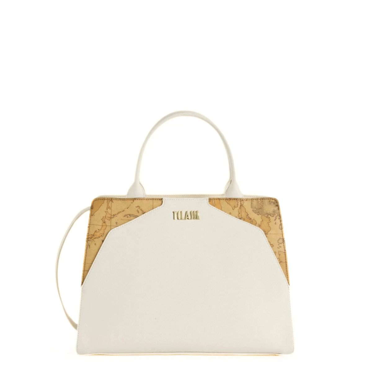 Le forme slanciate e aguzze dell'architettura indonesiana hanno ispirato il design della borsa a mano grande Java City di ALVIERO MARTINI 1^CLASSE in tessuto saffiano avorio, dove gli inserti ad angolo in tessuto Geo Classic incorniciano il logo 1ᴬ Classe in oro chiaro. La tracolla rimovibile e gli scomparti interni, corredati da ulteriori tasche, lo rendono un modello capiente e funzionale.