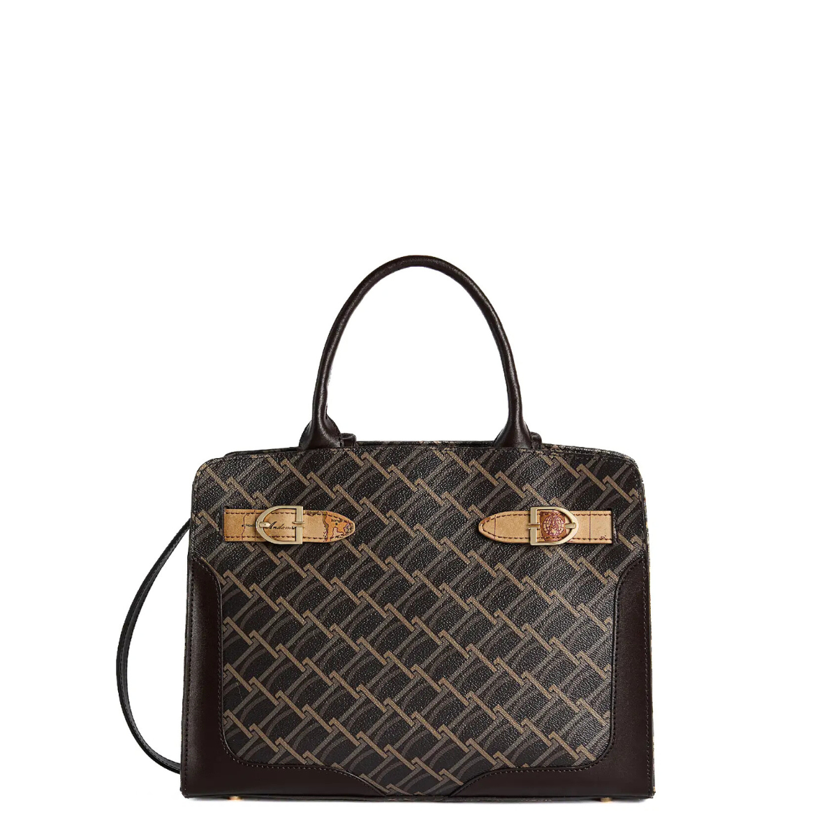 Borsa a spalla di ALVIERO MARTINI 1^ CLASSE dal look strutturato della linea Valley Monogram, che valorizza il nuovo tessuto Monogram 1C presentandosi in cromie avvolgenti e in un pattern obliquo. Presenta inserti in pelle liscia e listini con stampa Geo Classic arricchiti da fibbiette in oro.