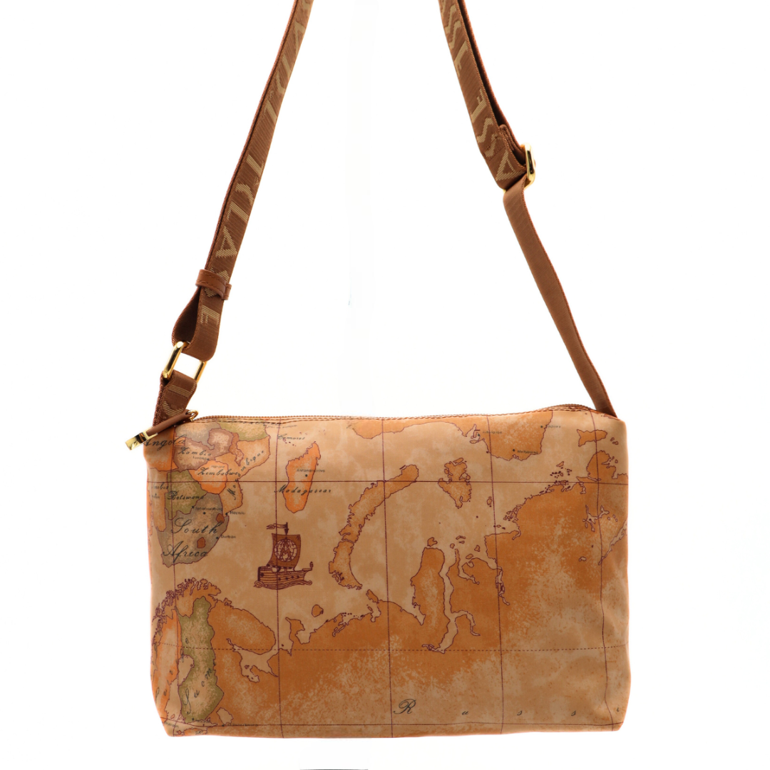 Borsa a tracolla Geo Soft di ALVIERO MARTINI 1^CLASSE. Realizzata in tessuto stampa Geo Classic, con tracolla in nastro logato regolabile. Comparto unico con chiusura con cerniera e interno foderato.