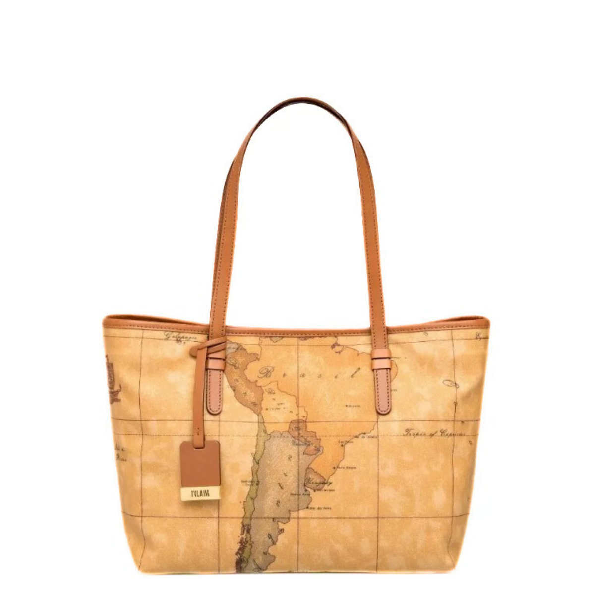 Borsa shopping in tessuto stampato con cartina geografica Geo Classic, con manici, chiusura con bottone a calamita, fondo in pelle di vacchetta, targhetta con logo. Capiente e contemporanea, ti permetterà di portare sempre con te tutto ciò che desideri.