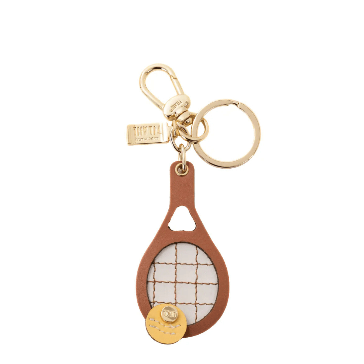 Portachiavi a forma di racchetta da tennis in tessuto stampa Geo Classic. Da utilizzare come charm per impreziosire le borse di collezione.