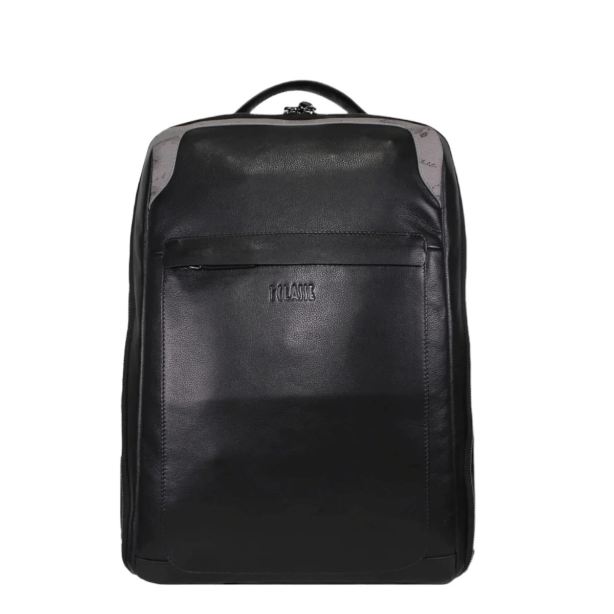 Zaino in pelle nera con inserto frontale in tessuto Geo Dark, spalucce regolabili . Pratico e funzionale, il modello ha una comoda tasca con zip sul fronte, e comparto principale con tasca porta pc e altre tasche accessorie. Il modello è completo di fascia per trolley.