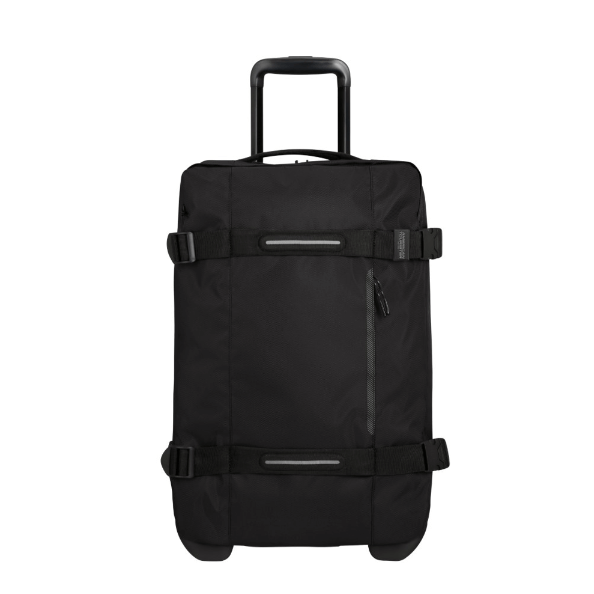 Borsone con ruote con misure da bagaglio a mano di AMERICAN TOURISTER della linea URBAN TRACK. Realizzato in tessuto riciclato nero, doppia apertura entrambe chiuse con zip, una con cinghe ferma abiti. Chiusura con zip, ganci e sicurezza con combinazione e sistema TSA. Fondo rinforzato per permettere ai borsoni di stare in piede da soli. Due ruote.