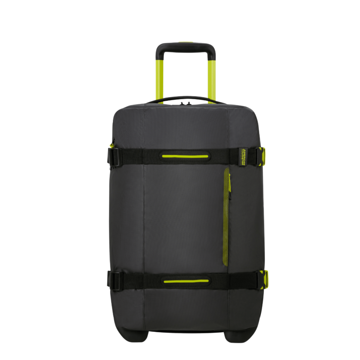 Borsone con ruote con misure da bagaglio a mano di AMERICAN TOURISTER della linea URBAN TRACK. Realizzato in tessuto riciclato spalmato nero con profili lime, doppia apertura entrambe chiuse con zip, una con cinghe ferma abiti. Chiusura con zip, ganci e sicurezza con combinazione e sistema TSA. Fondo rinforzato per permettere ai borsoni di stare in piede da soli. Due ruote.