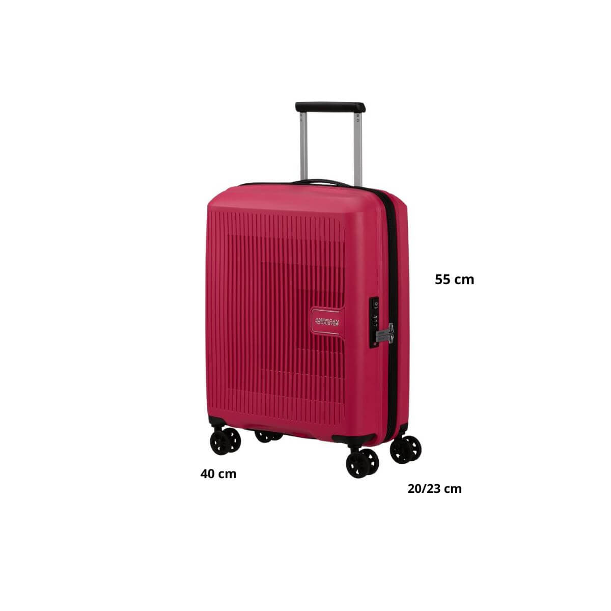Bagaglio a mano rigido, della linea AEROSTEP di AMERICAN TOURISTER dal design unico e avanzate tecnologie color fuxia. Realizzato in Polypropylene. Vano interno organizzato con divisorio e cinghie elastiche. Chiusura con combinazione e sistema TSA. Quattro ruote bidirezionali. Carrello bitubo. Valigia espandibile.