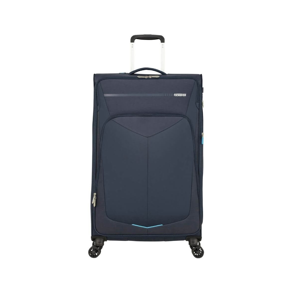 Trolley grande morbido, della linea SUMMERFUNK di AMERICAN TOURISTER dal design unico e avanzate tecnologie color blu. Realizzato in tessuto. Interno con unica tasca foderata e tasca in rete per accessori. Chiusura con combinazione e sistema TSA. Quattro ruote bidirezionali . Carrello bitubo. Valigia espandibile.