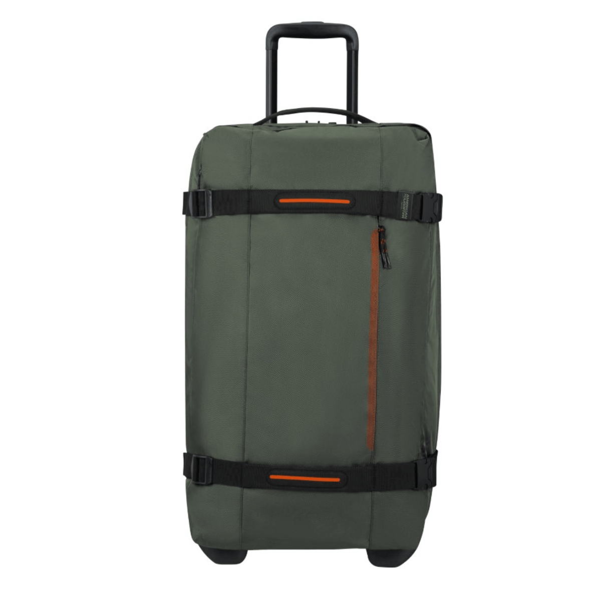 Borsone con ruote con misure da trolley medio di AMERICAN TOURISTER della linea URBAN TRACK. Realizzato in tessuto riciclato verde con profili arancioni, doppia apertura entrambe chiuse con zip, una con cinghe ferma abiti. Chiusura con zip, ganci e sicurezza con combinazione e sistema TSA. Fondo rinforzato per permettere ai borsoni di stare in piede da soli. Due ruote.