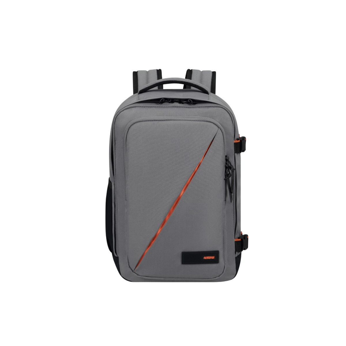 Zaino da viaggio di AMERICAN TOURISTER della linea TAKE2CABIN, realizzato in tessuto grigio con inserti arancioni. Internamento composto da uno scomparto con ganci ferma abiti. Tasca frontale con porta accessori. Chiusura con zip. Tasca laterale con retina per mettere la tua borraccia. Gancio smart sleeve per una facile trasporto con la tua valigia. Compatibile con Ryanair.