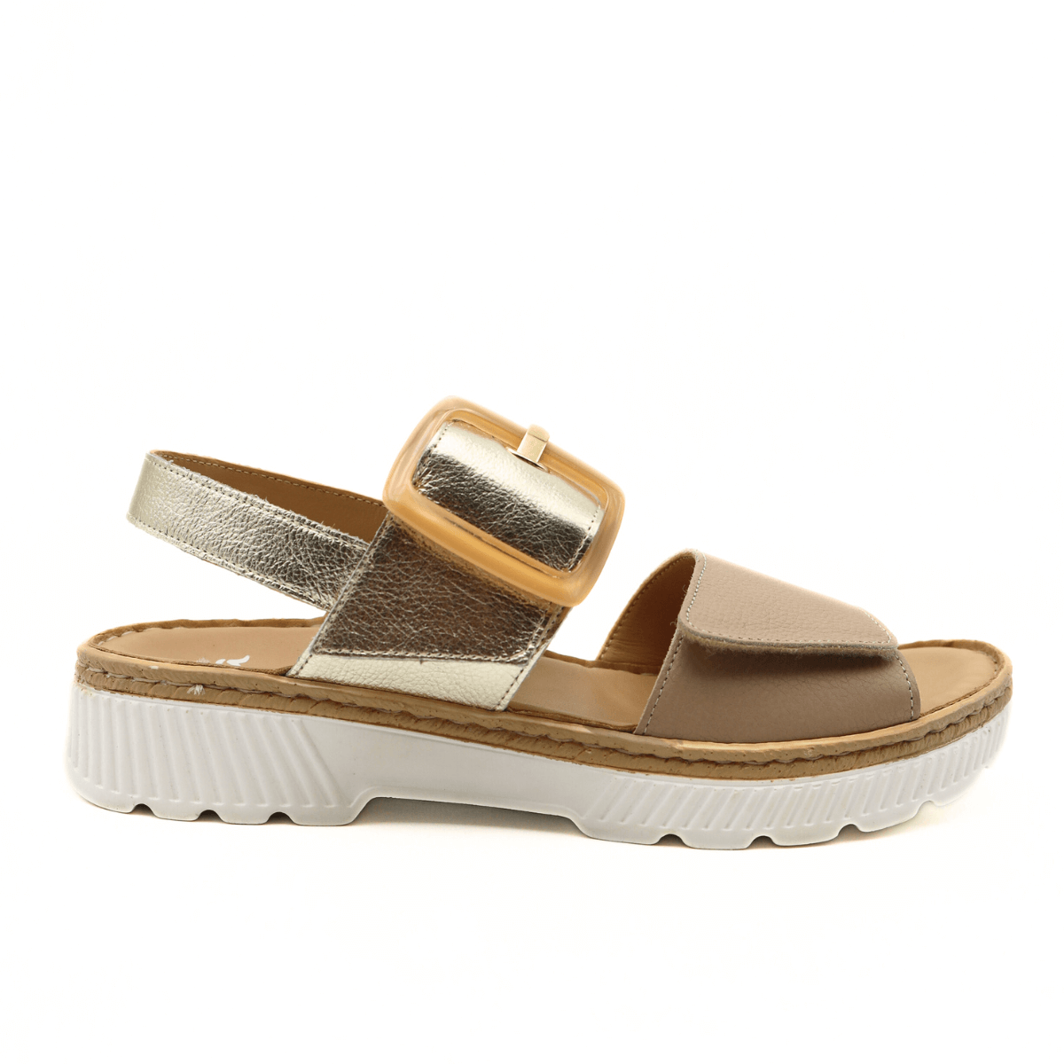 Sandalo da donna di ARA. Tomaia realizzata in pelle beige e laminata argento con fibbia. Interno e sottopiede foderati in pelle. Chiusura con strappo. Suola in gomma.