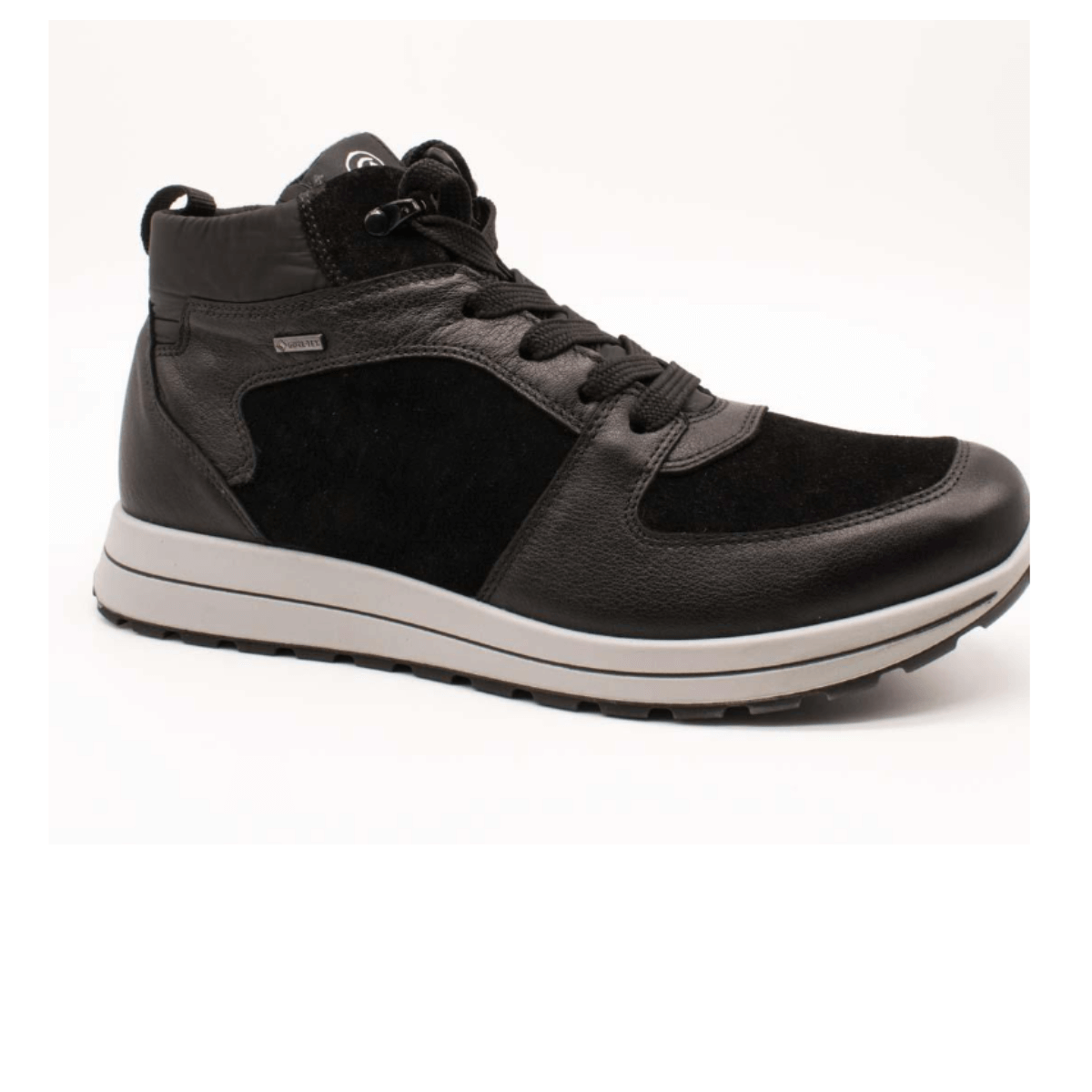 Sneakers alta casual da uomo di ARA. Tomaia in pelle e camoscio nero, zip unilaterale. Interno foderato in pelle con sottopiede morbido estraibile. Chiusura con lacci. Suola in gomma.