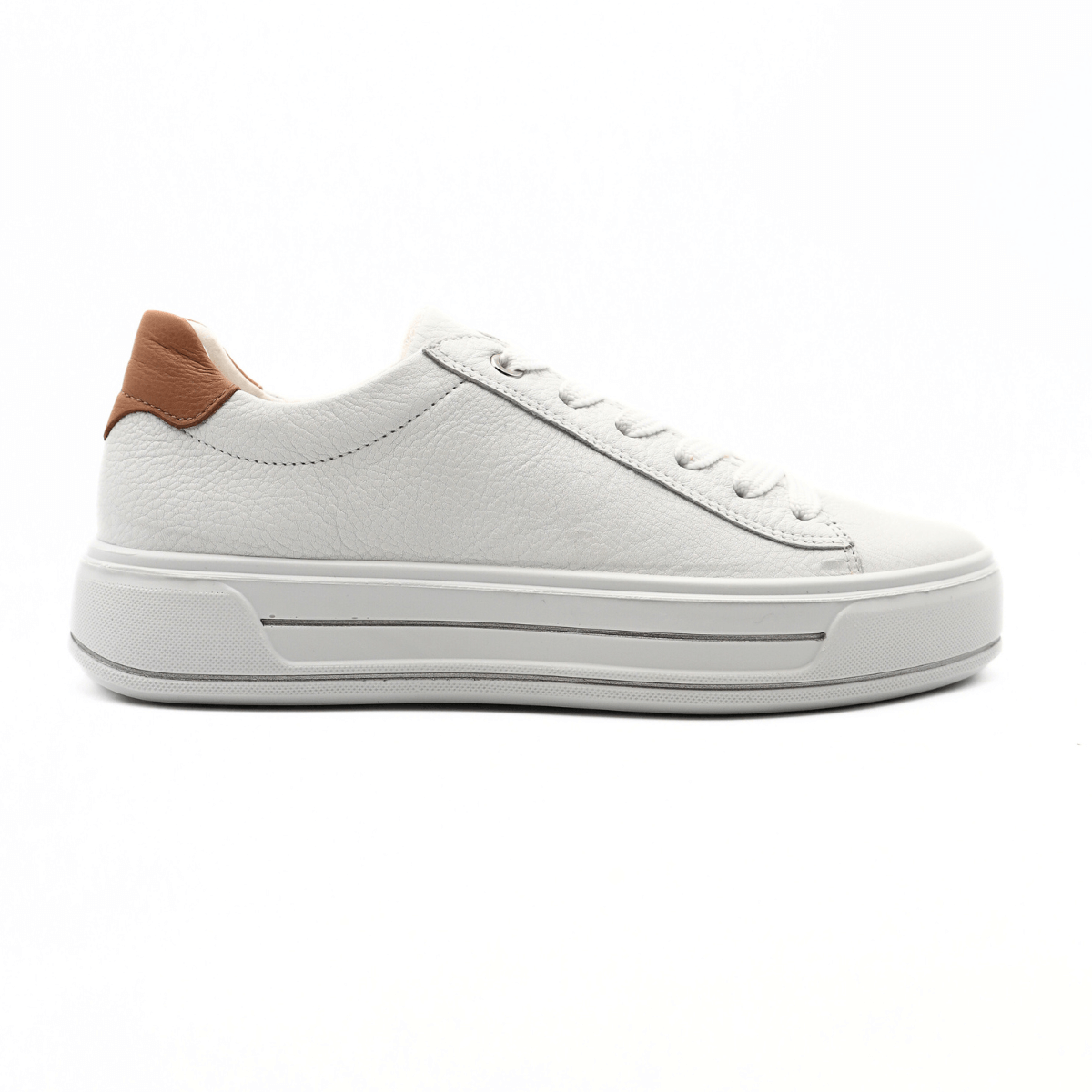 Sneaker da donna di ARA. Tomaia realizzata in morbida pelle bianca e tallone rosa nude. Internamente foderata in tessuto; sottopiede anatomico HighSoft, ammortizzato ed estraibile. Chiusura con lacci. Suola in gomma leggera ed ammortizzata.