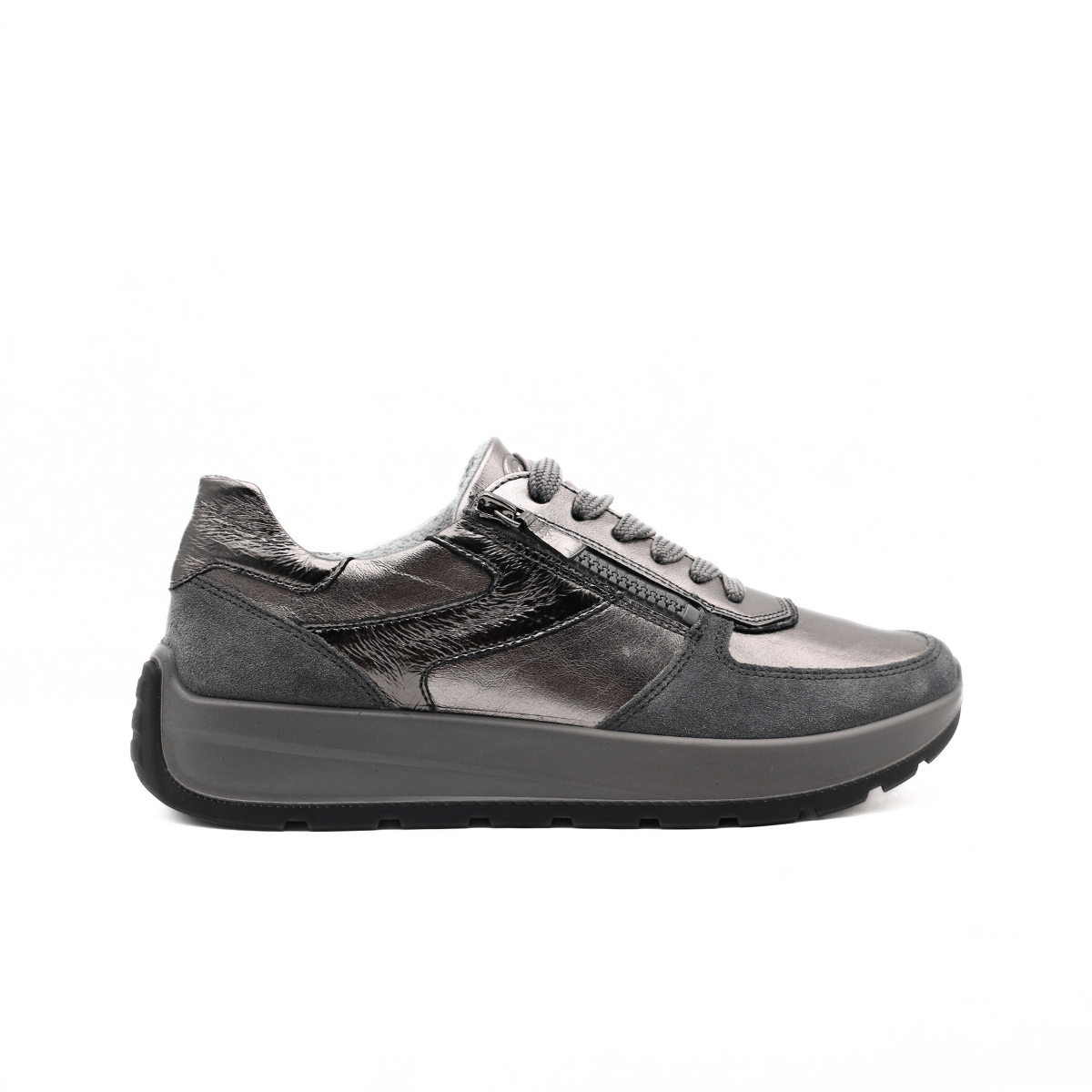Leggera sneaker da donna stile running di ARA. Tomaia realizzata in morbida pelle laminata argento ed inserti in camoscio. Internamente foderata in tessuto; sottopiede anatomico HighSoft, ammortizzato ed estraibile. Chiusura con lacci e zip unilaterale. Suola in gomma.