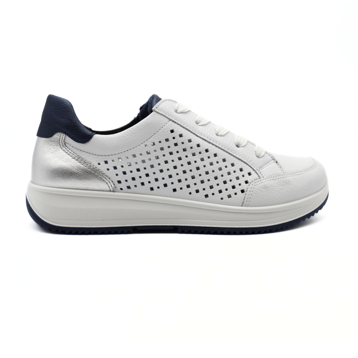 Leggera sneaker da donna stile running di ARA. Tomaia realizzata in morbida pelle bianca con parte forata laterale e inserti blu. Internamente foderata tessuto; sottopiede anatomico HighSoft, ammortizzato ed estraibile. Chiusura con lacci e zip unilaterale. Suola in gomma leggera ed ammortizzata.