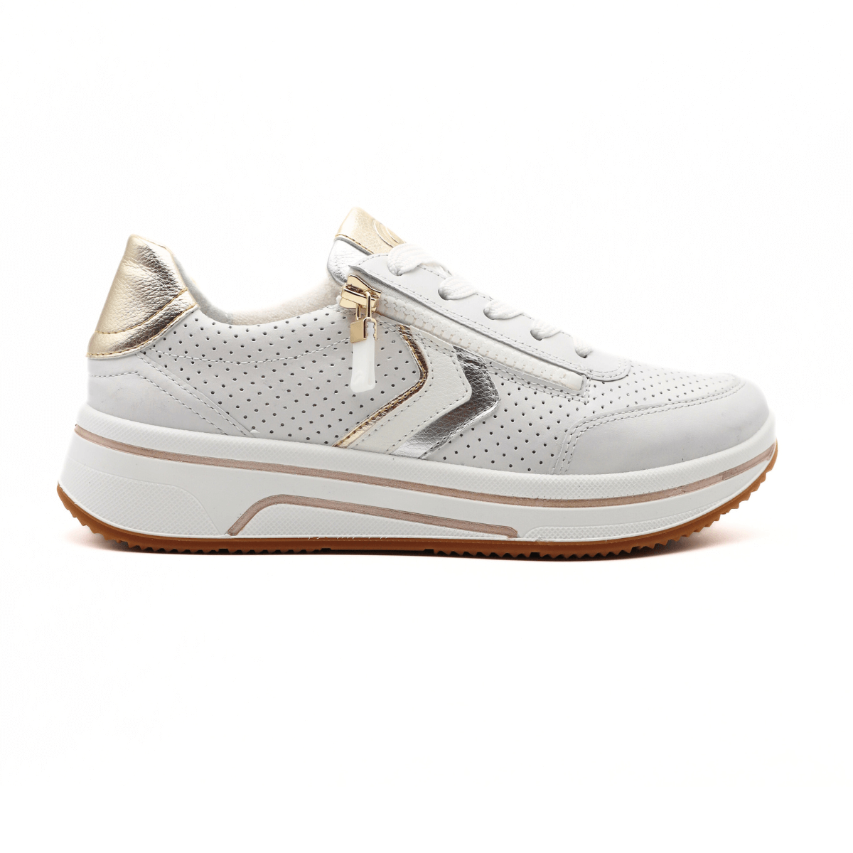 Leggera sneaker da donna stile running di ARA. Tomaia realizzata in morbida pelle bianca microforata ed inserti oro. Internamente foderata in tessuto; sottopiede anatomico HighSoft, ammortizzato ed estraibile. Chiusura con lacci e zip unilaterale. Suola in gomma leggera ed ammortizzata.