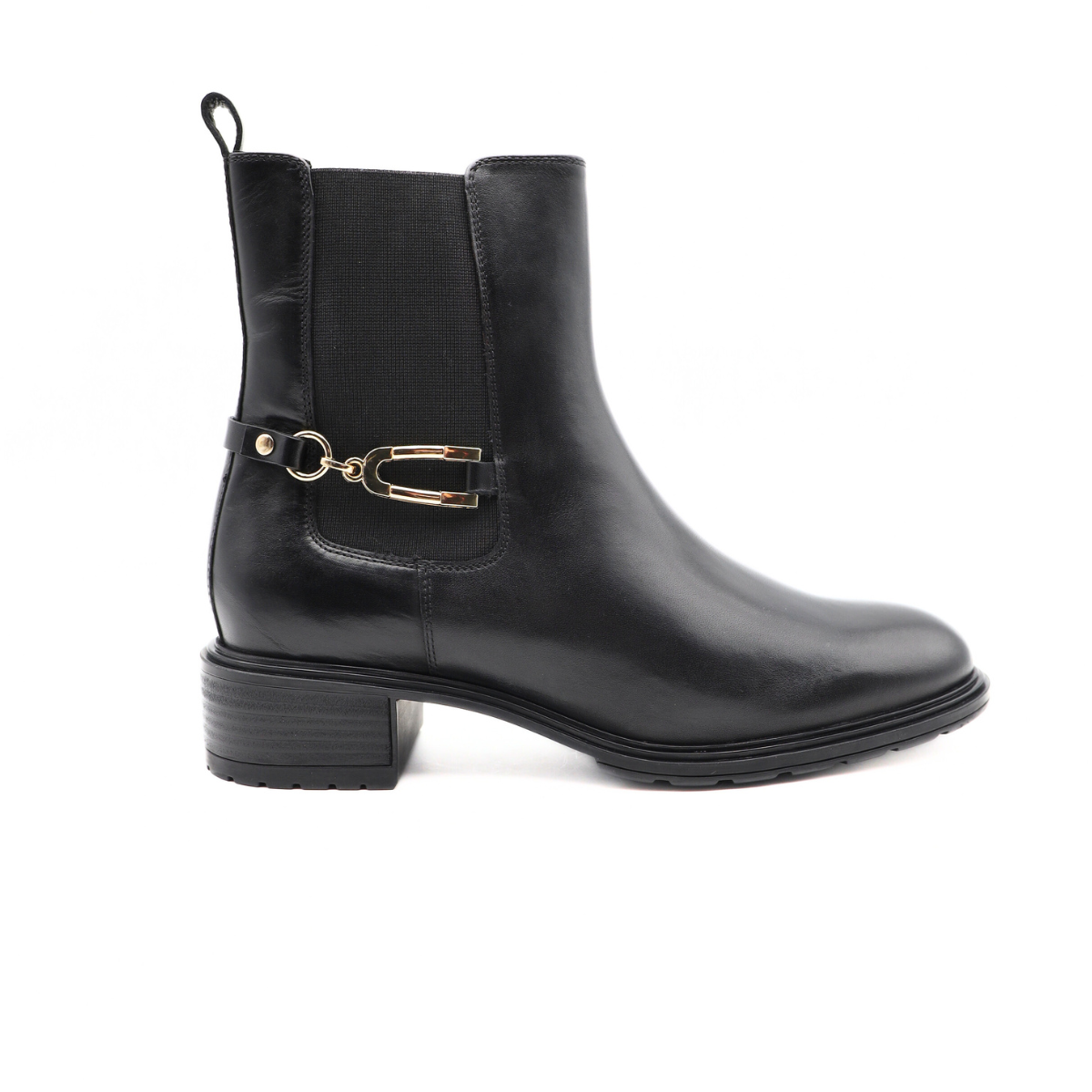 Stivaletto, da donna, di ARA. Realizzato in pelle nera, con fibbia oro unilaterale ed elastico. Interno foderato e sottopiede foderato in tessuto ed estraibile. Chiusura con cerniera lato laterale interno. Suola in gomma.