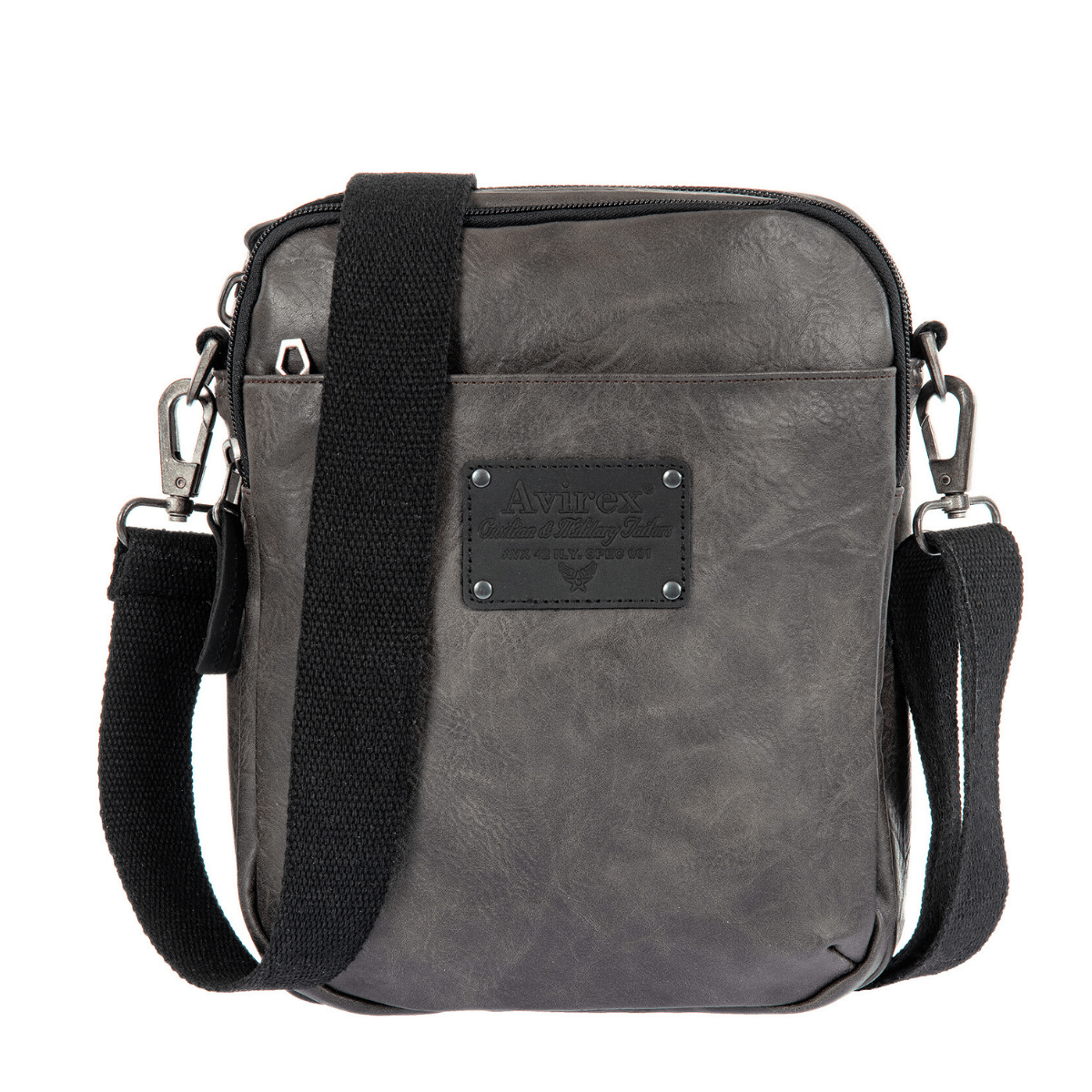 Borsello da uomo di AVIREX realizzato in ecopelle grigia. Interno unico comparto con tasche accessorie. Tracolla in tessuto nera regolabile. Chiusura con cerniera.