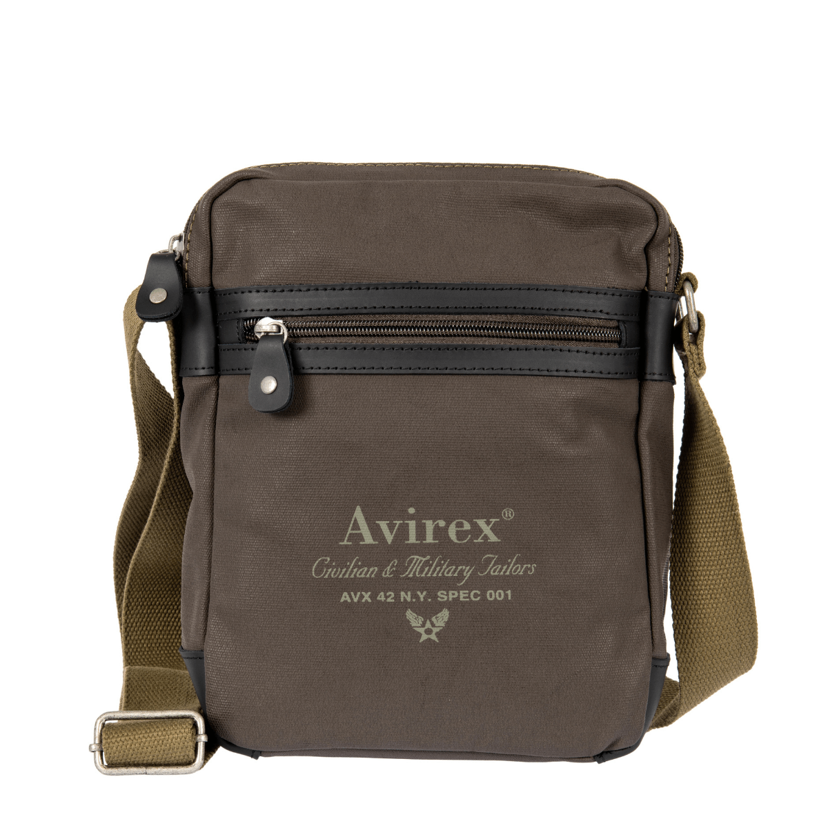 Borsello da uomo di AVIREX realizzato in tessuto color fango. Interno unico comparto con tasche accessorie. Tracolla in tessuto verde militare regolabile. Chiusura con cerniera.