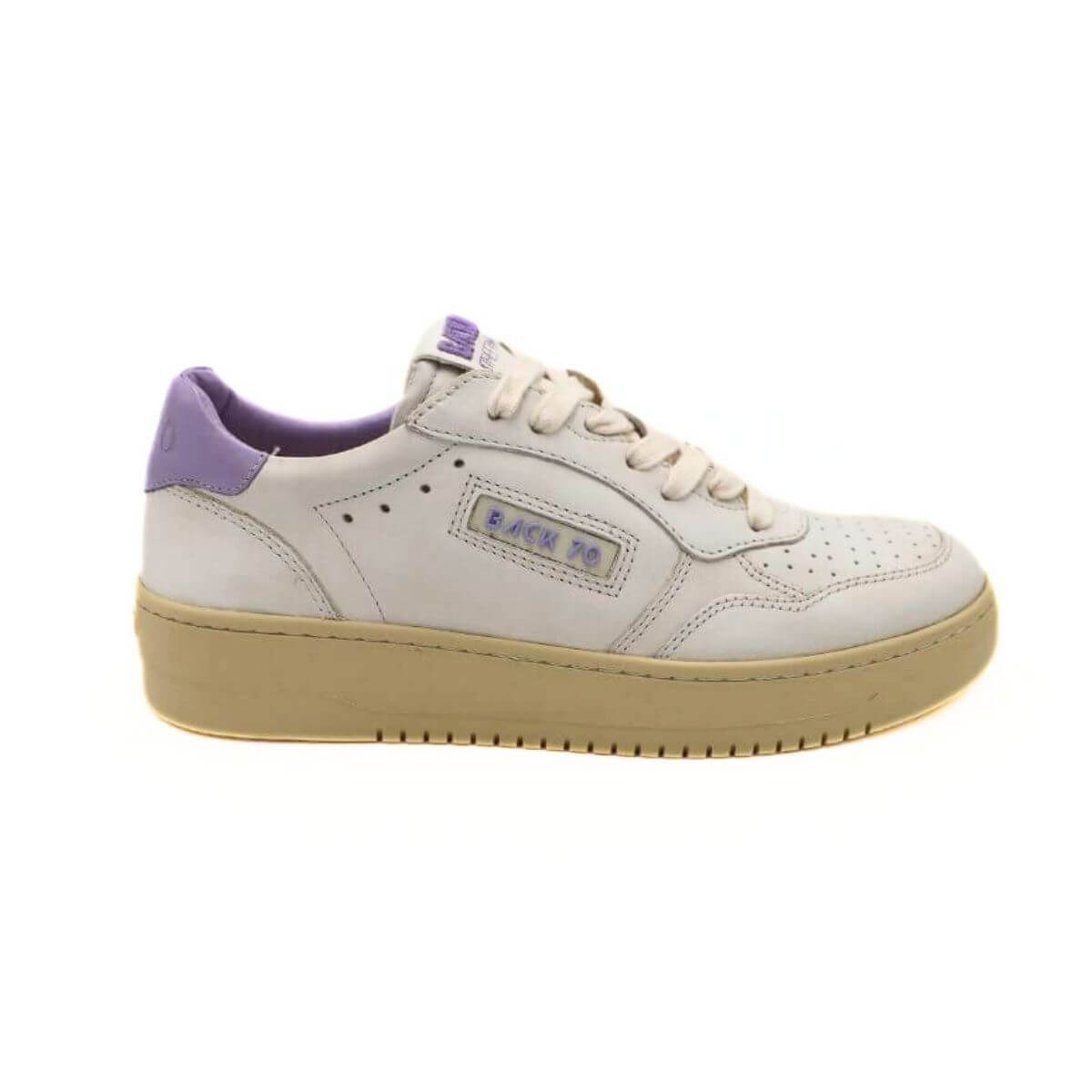 Sneaker da donna, di BACK70. Realizzata in pelle bianca, con tallone lilla. Internamente foderata in pelle e tessuto con sottopiede non estraibile. Chiusura con lacci. Suola in gomma (altezza 3cm).