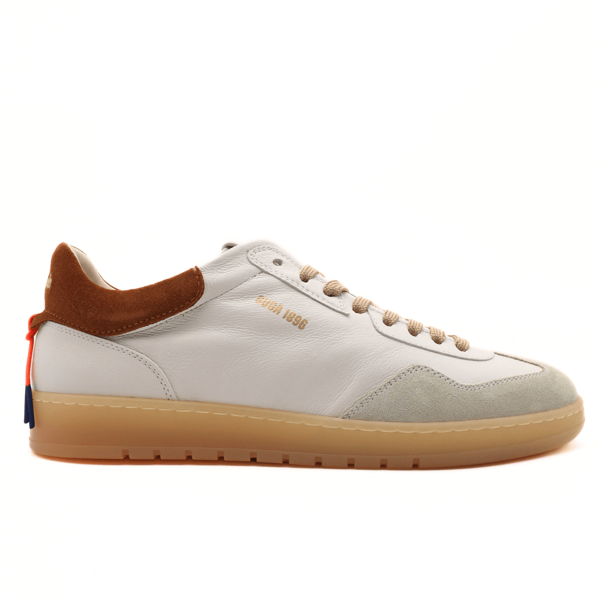 Sneaker da uomo di BARRACUDA, realizzata in pelle bianca con taglio ciclista, tallone e punta in camoscio. Interno foderato in spugna e sottopiede, estraibile, in pelle. Chiusura con laccio. Laccetto arancione sul tallone di bellezza, removibile. Suola color miele.