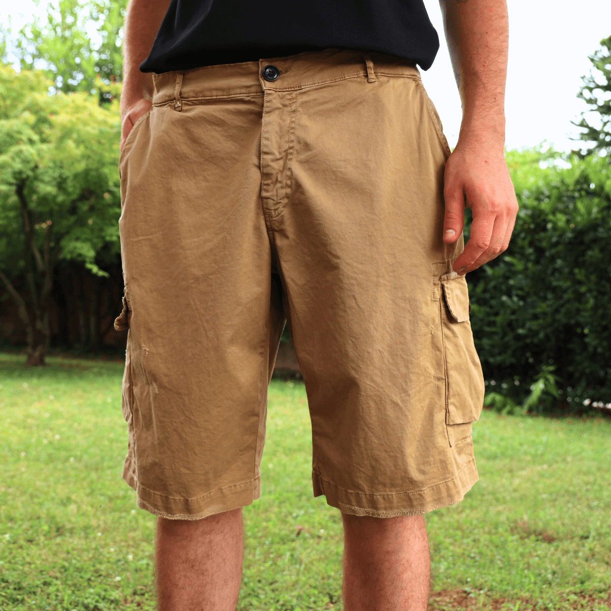 Pantalone corto da uomo modello cargo di BERNA. Realizzato in cotone color beige scuro con chiusura con bottone e zip e con tasche laterali.
