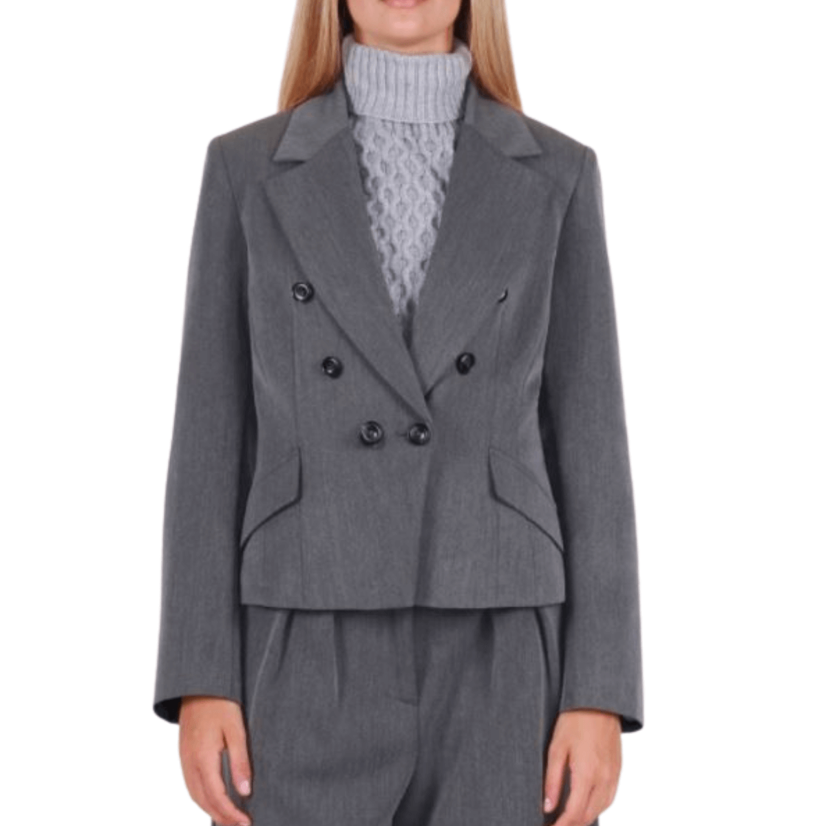 Giacca doppiopetto di BERNA. Realizzata in tessuto grigio, modello leggermente sfiancato. Chiusura con bottoni.