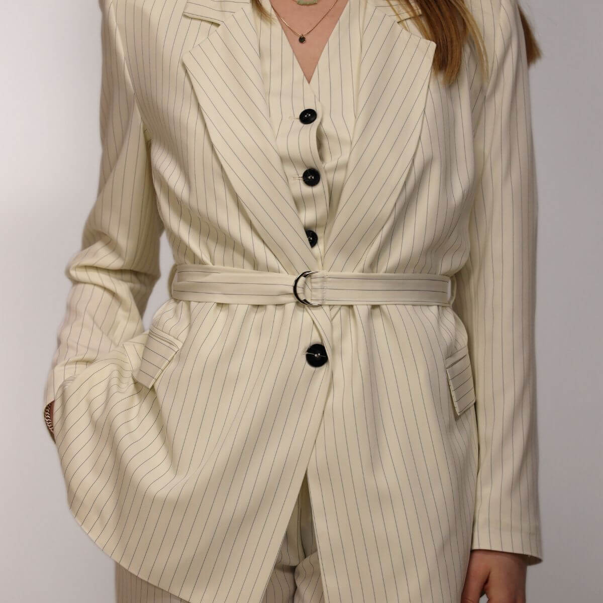 Giacca da donna, di BERNA. Realizzata in poliestere color panna a righe, con cintura in vita.