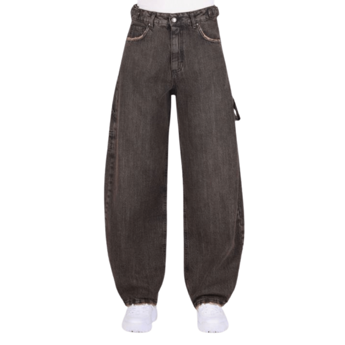 Jeans di BERNA modello balloon. Tasche anteriori e posteriori. Vestibilità regolare. Possibilità di stringere ai fianchi grazie ad apposite fibbie. Le taglie sono da considerare all'italiana: