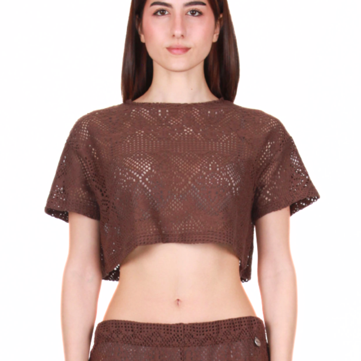Crop top marrone cioccolato di BERNA. Realizzato in pizzo macramè in misto cotone.