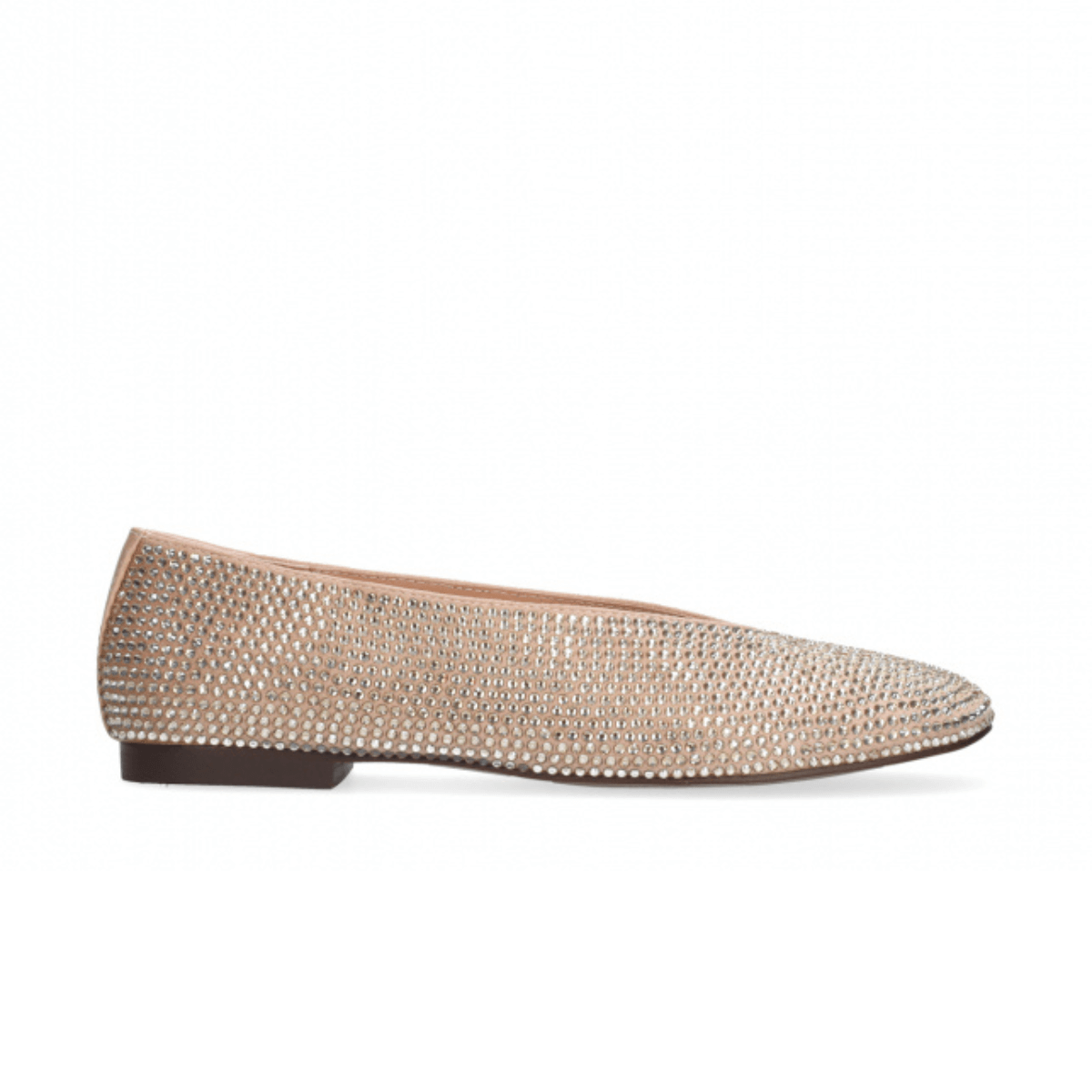 Ballerina da donna di BIBI LOU, realizzata in tessuto effetto scamosciato nude con brillantini in tono. Interno e sottopiede, non estraibile, in morbida pelle. Suola in gomma effetto cuoio.