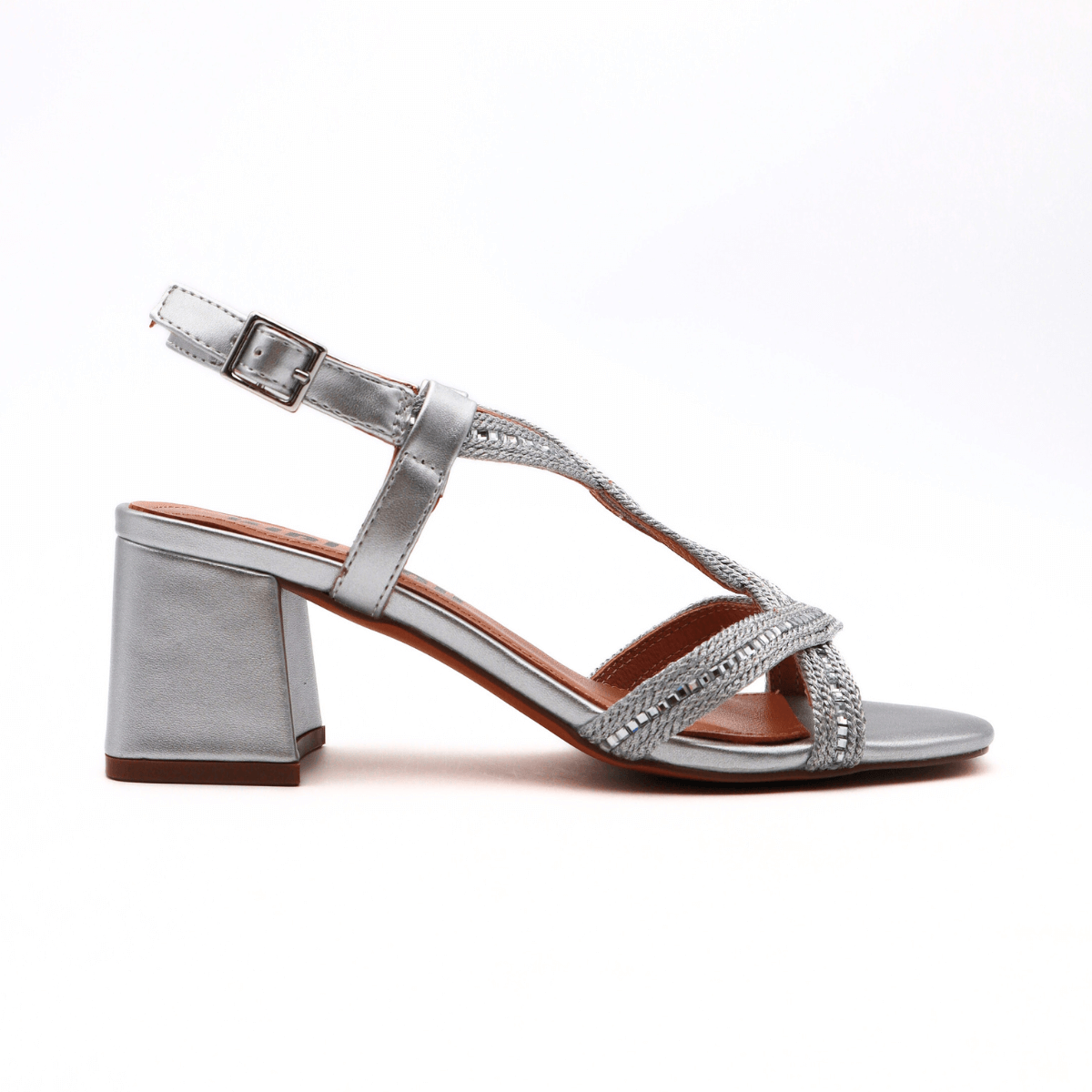 Sandalo da donna di BIBI LOU, realizzato in tessuto effetto treccia con brillantini e cinturino regolabile in similpelle argento. Interno e sottopiede, non estraibile, foderati in pelle. Tacco largo foderato 6 cm.