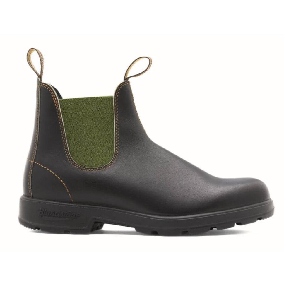 Beatles da uomo di BLUNDSTONE. Realizzato utilizzando un unico pezzo di pelle premium completamente sfoderato per garantire una maggiore traspirabilità color marrone con elastici laterali in tessuto verde. Interno foderato in pelle con sottopiede estraibile rivestito in tessuto. Scarpa resistente all'acqua. La suola in TPU garantisce estrema aderenza su qualsiasi superficie, offrendo massima stabilità e supporto ottimale per tutto il giorno.