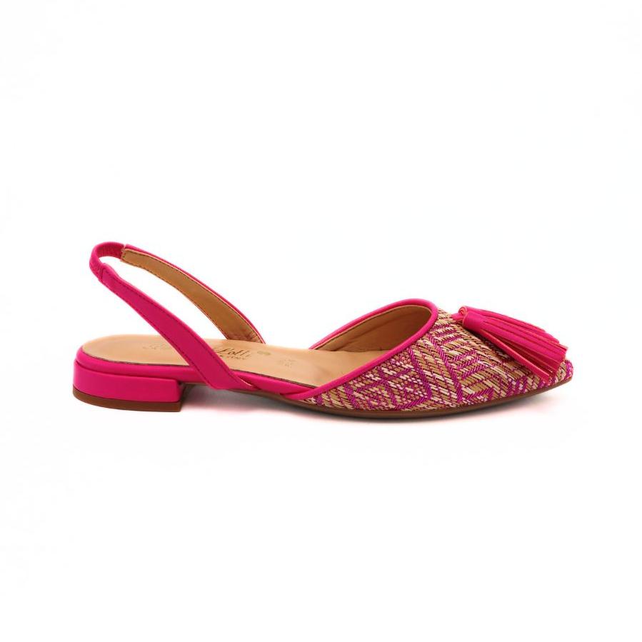 Slingback da donna di BOTTEGA LOTTI. Realizzata con una tomaia in raffia intrecciato color fuxia effetto paglia, con nappina rosa e cinturino elastico. Questa scarpa è caratterizzata da un sottopiede in pelle per un comfort duraturo. Suola in gomma e un design MADE IN ITALY, questa è la scelta perfetta per un look sofisticato e di tendenza.
