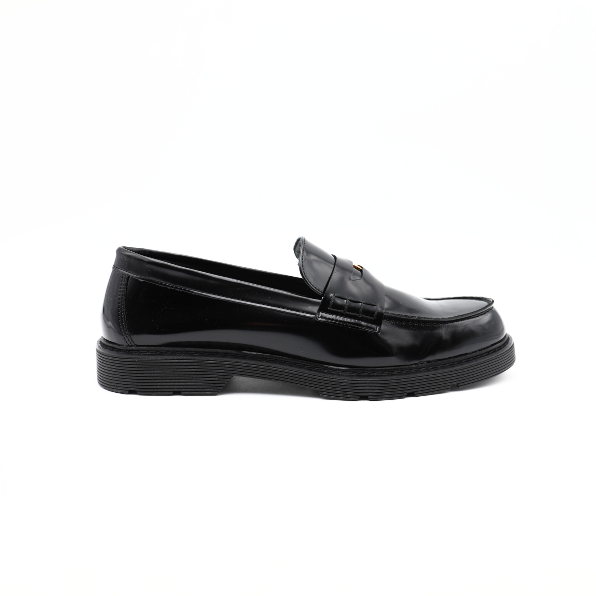 Mocassino da donna modello college di BOTTEGA LOTTI realizzato in ecopelle spazzolata color nero. Presenta la mascherina con monetina oro incastonata. Sottopiede rivestito in pelle, suola in gomma con battistrada rialzato.