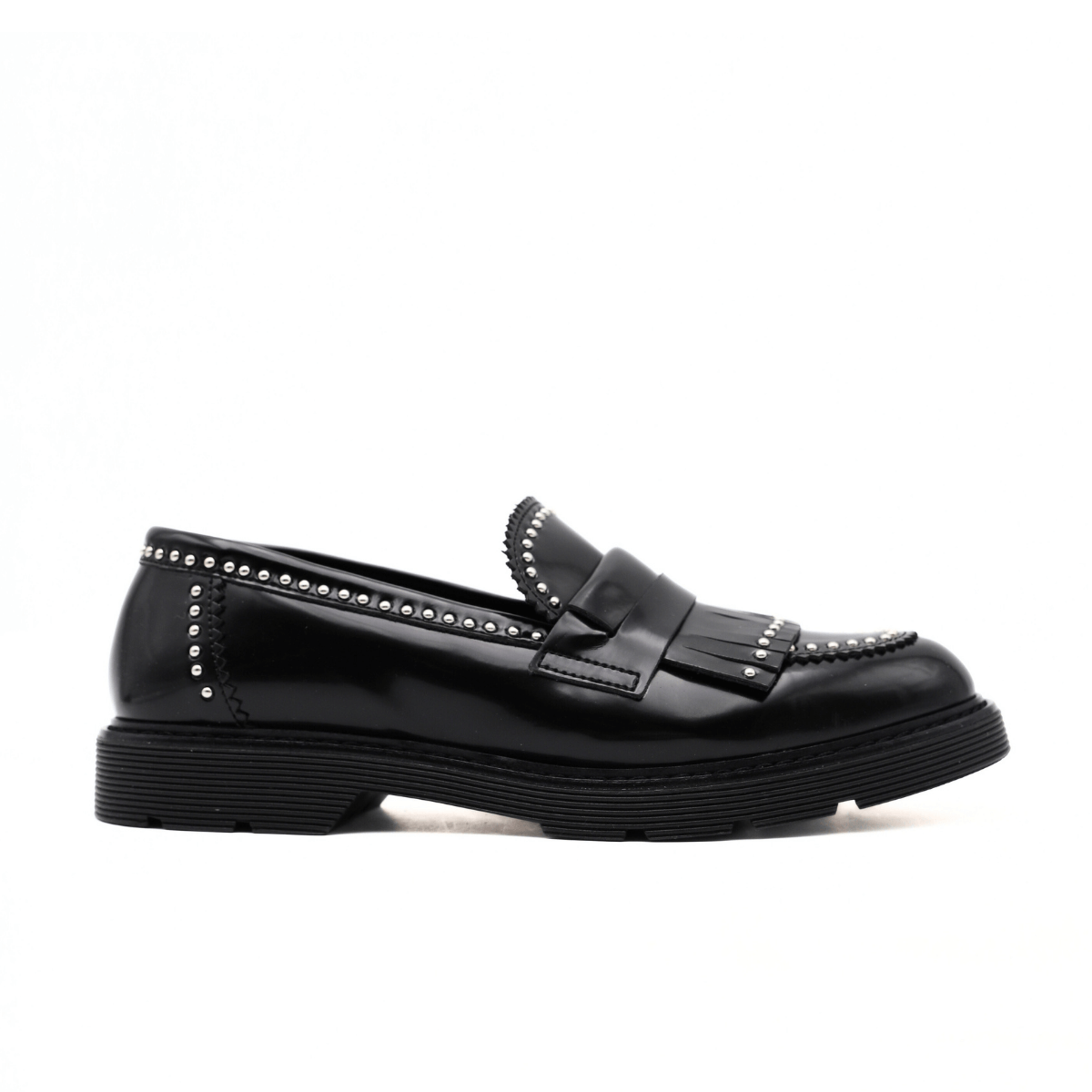 Mocassino da donna modello college di BOTTEGA LOTTI realizzato in pelle nero con borchie. Sottopiede rivestito in pelle, suola in gomma carrarmato.