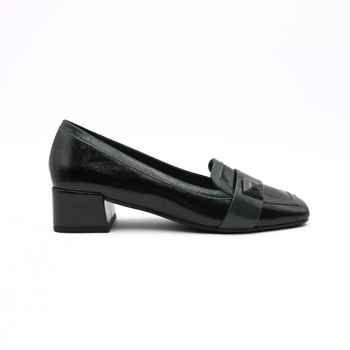 Mocassino da donna di BOTTEGA LOTTI realizzato in ecopelle effetto naplak. La tomaia presenta dettagli a contrasto colore nero e maxi borchia nera. Sottopiede rivestito in pelle e suola in gomma.