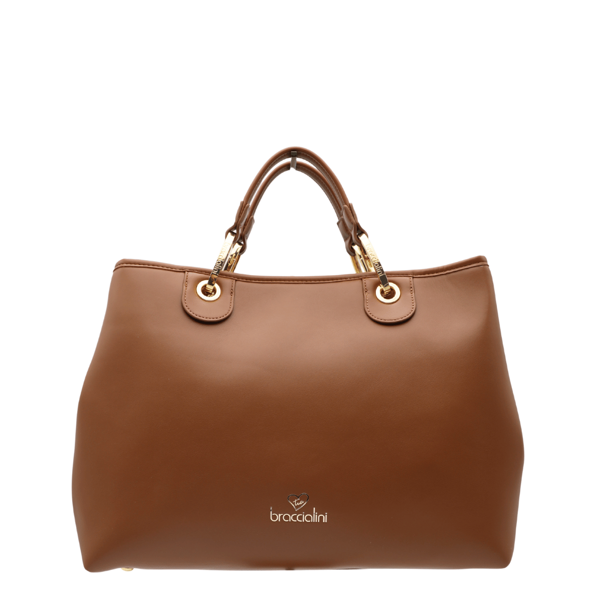 Borsa a mano di BRACCIALINI modello BETH realizzata in ecopelle morbida e liscia. Divisa in tre scomparti, di cui uno con cerniera. Interno foderato in tessuto. Pratici manici removibili con ganci dorati brandizzati e tracolla in tono regolabile e removibile. Piedini e inserti dorati a contrasto.