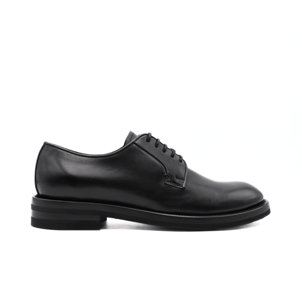 Stringata di CALPIERRE modello derby, realizzata in pelle liscia nera con cuciture a vista.