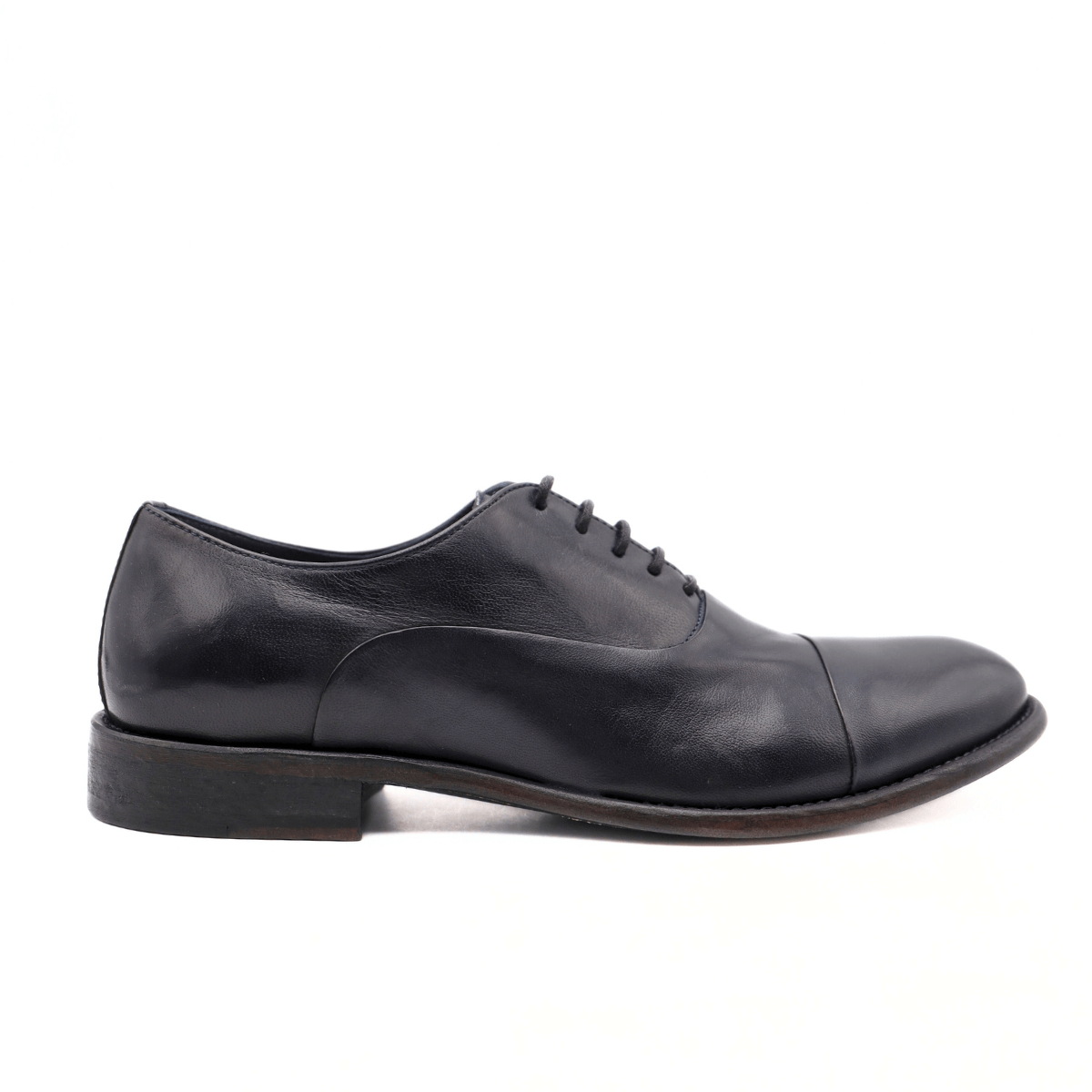 Scarpa, elegante, stringata da uomo di CALPIERRE. Tomaia realizzata in pelle blu, modello francesina, con cuciture a vista. Interno foderato e sottopiede in pelle non removibile. Suola in gomma e cuoio. Chiusura con laccio fino.