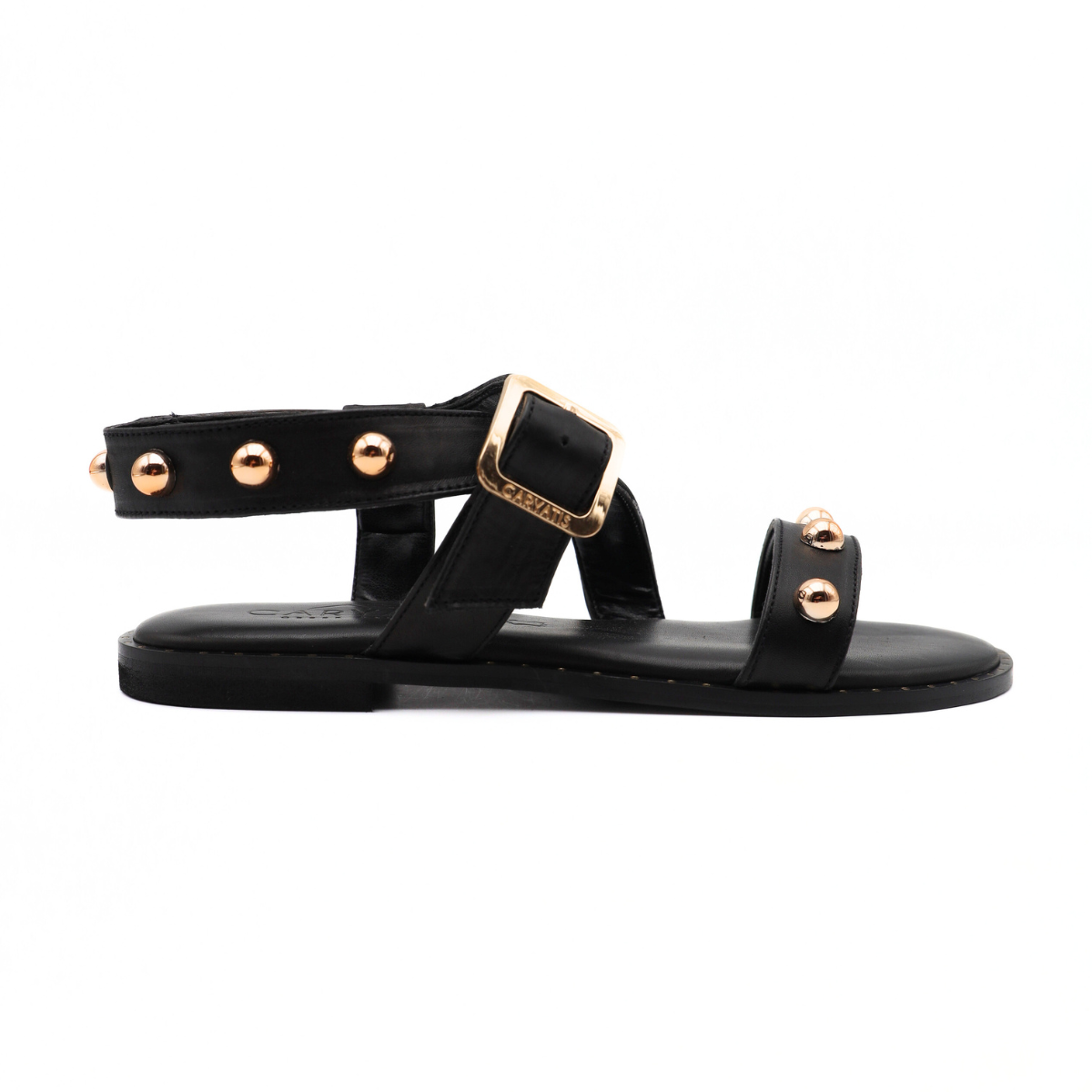 Sandalo greco di CARYATIS. Realizzato in pelle nera con borchie oro, Chiusura con fibbia regolabile alla caviglia. Morbido appoggio nel sottopiede foderato in pelle, suola in gomma antiscivolo, tacco 2 cm.