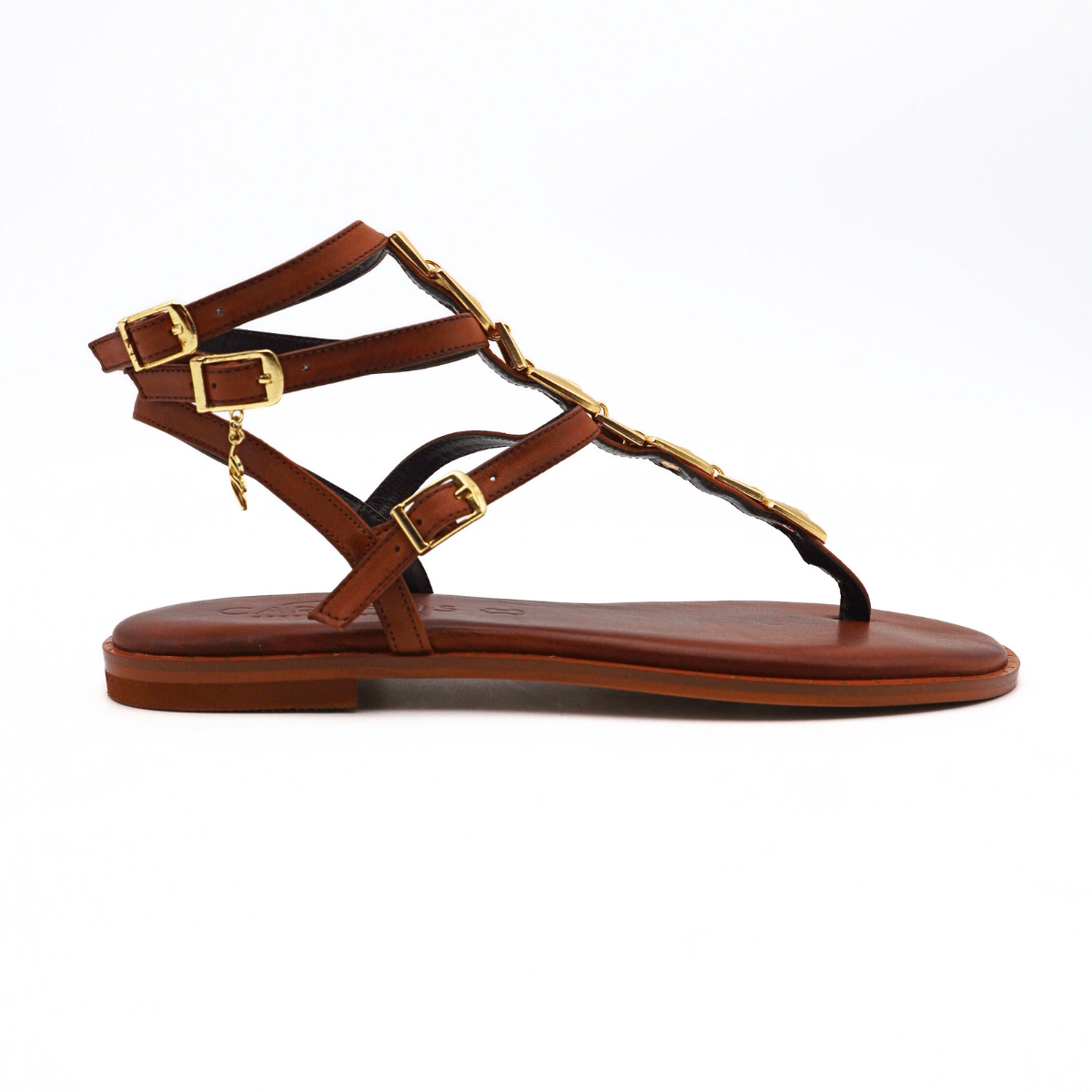 Sandalo greco in pelle marrone, decorato con accessori oro, di CARYATIS. Chiusura con cinturini regolabili. Morbido appoggio nel sottopiede foderato in pelle, suola in gomma antiscivolo, tacco 2 cm.