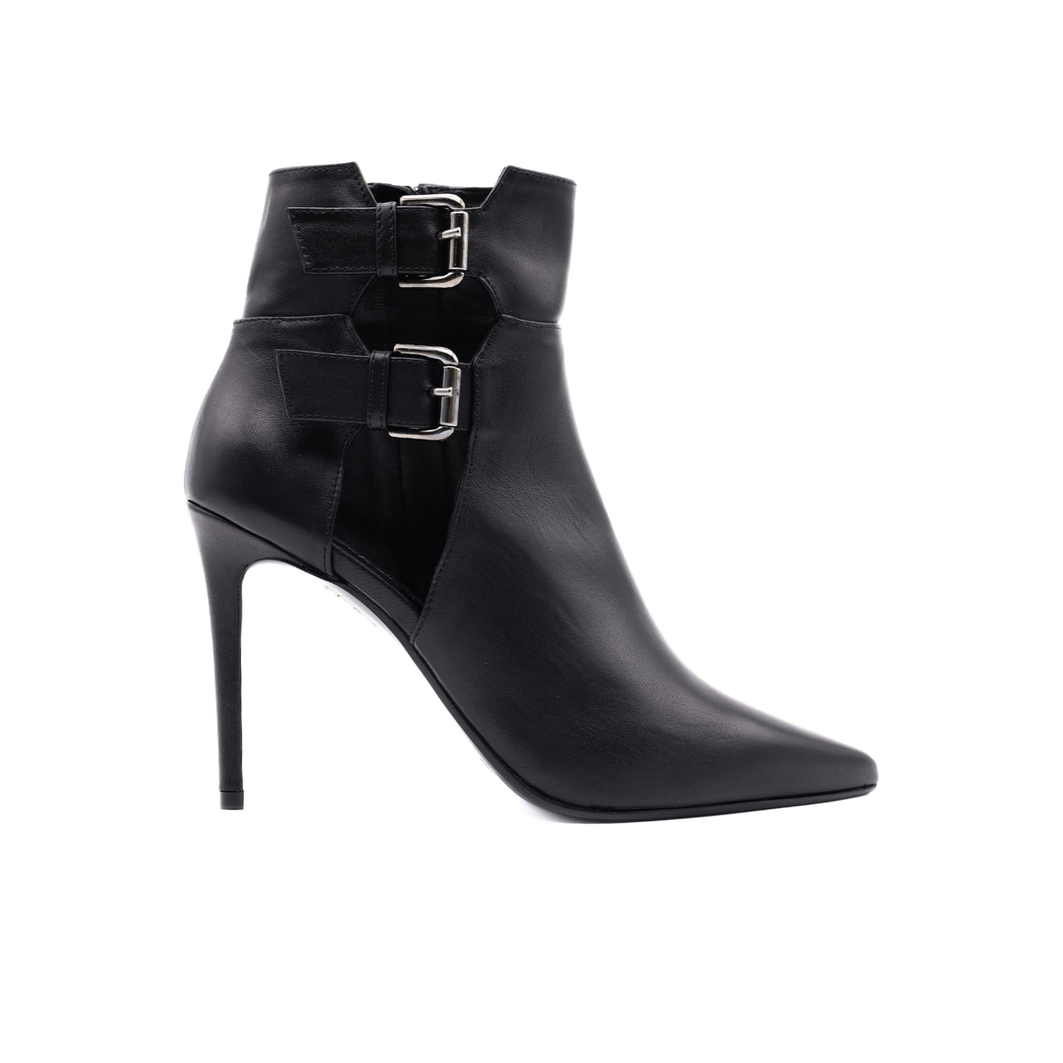 Stivaletto nero di CHANTAL 1962 in pelle con tacco a stiletto di 10 cm, decorato con due fibbie unilaterali. Suola in cuoio e gomma.
