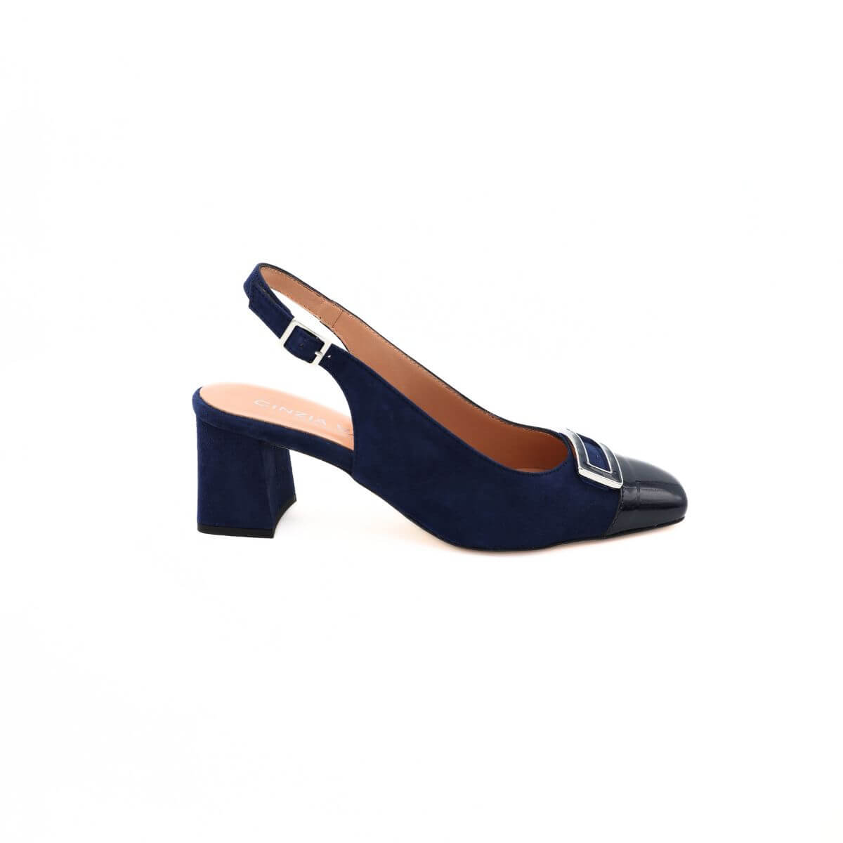 Slingback da donna di CINZIA VALLE, realizzata in camoscio blu con punta e tacco in vernice, con fibbia decorativa. Interno e sottopiede, morbido, rivestite in pelle. Suola in cuoio, tacco 5,5 cm. Chiusura con cinturino regolabile.